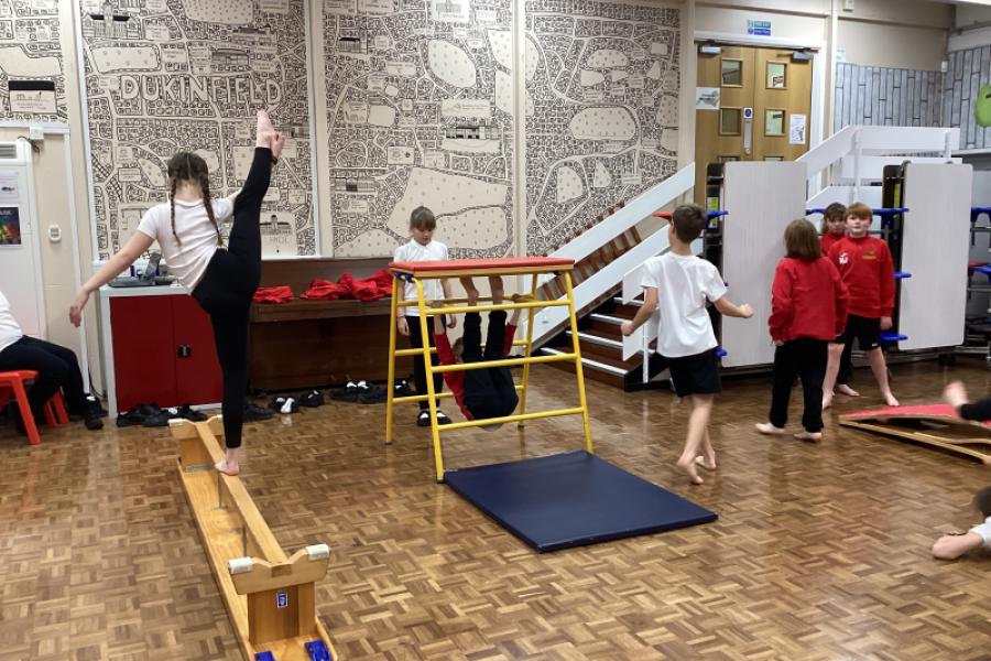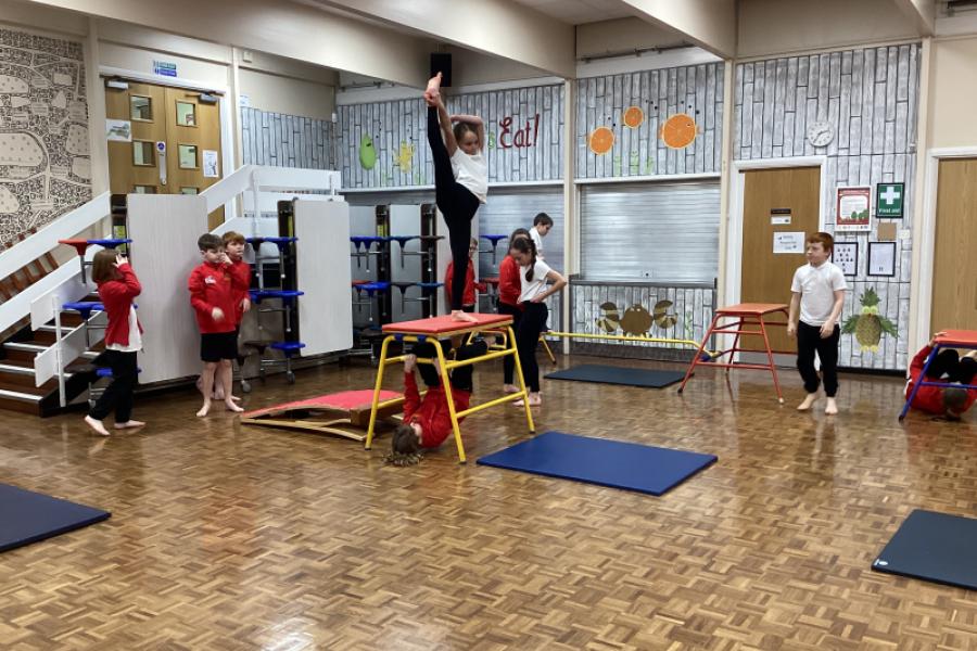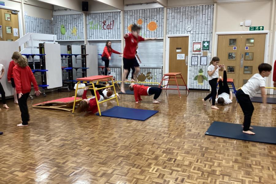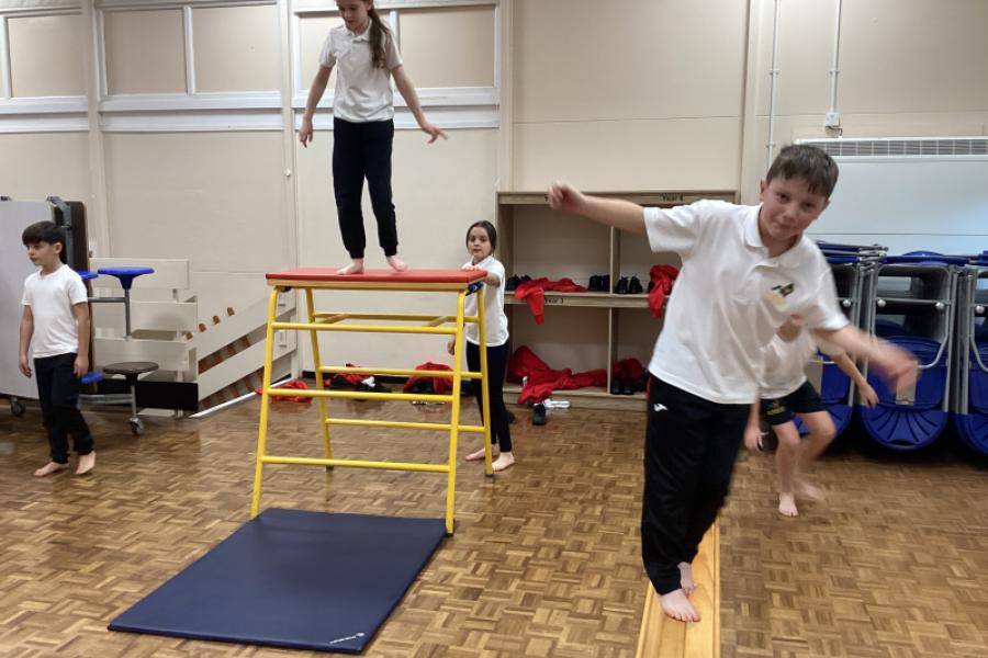 Year 5 were applying their gymnastics knowledge to the apparatus? This included jumps, balances, hand stands, bridges and crabs.
