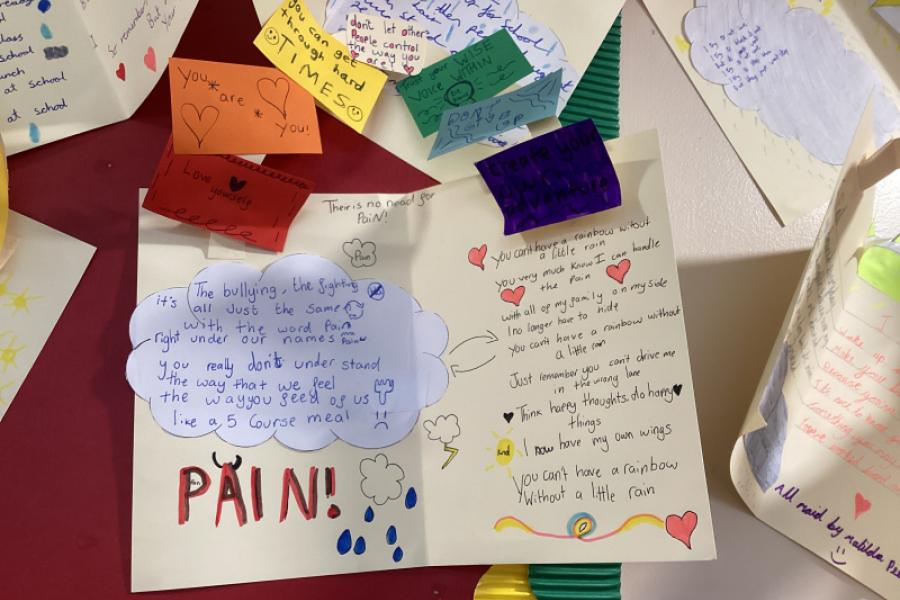 In our mental health work this week, Year 6 explored their emotions. They wrote poems about feeling anxious, bullied or down and then wrote advice and positive affirmations to support their mental health. I was very impressed by their work, so it was put on display in the library area.