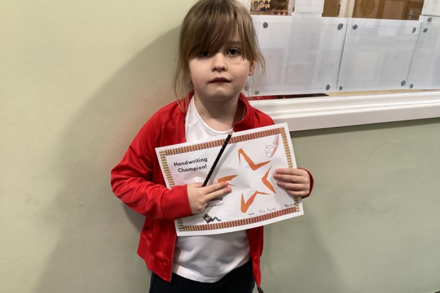 Congratulations to all of our handwriting winners selected for their beautiful handwriting or for improvement in their letter formation and motor skills. All our winner's work is displayed on the board outside Mrs Parker's office and they all win a pencil.