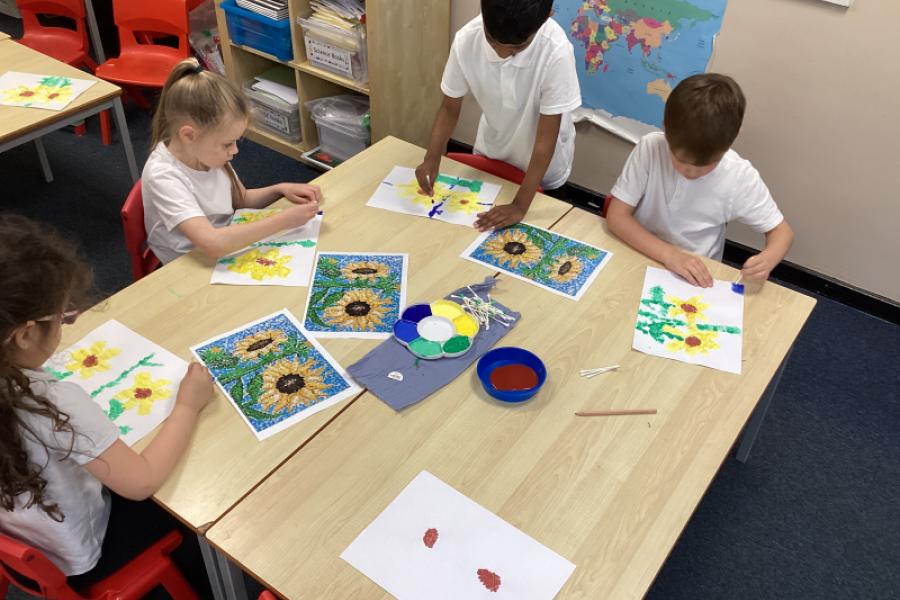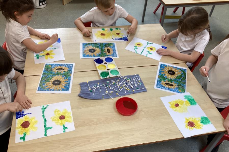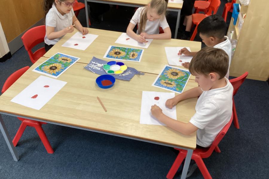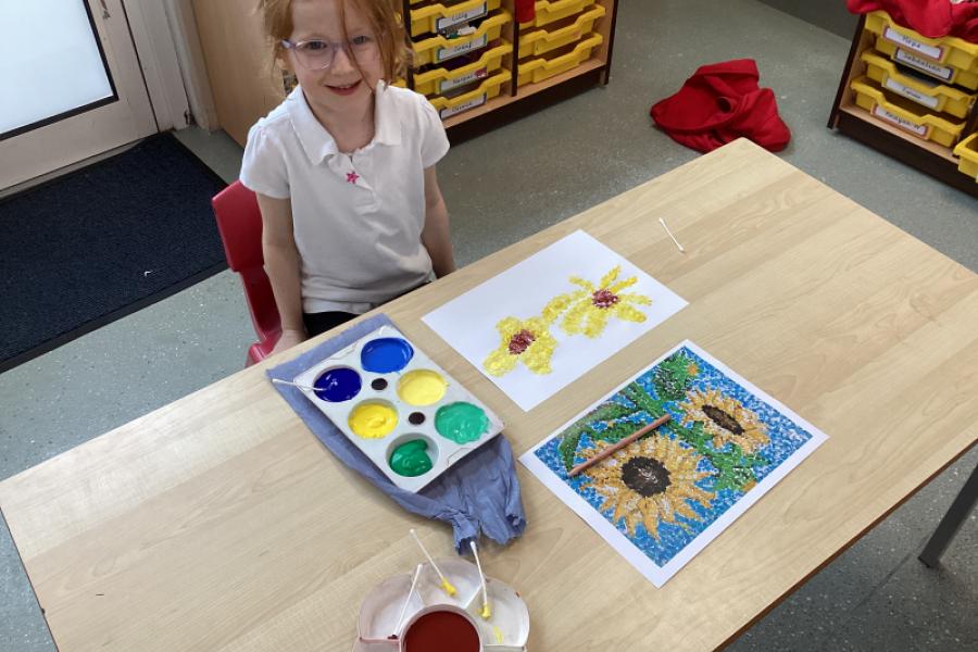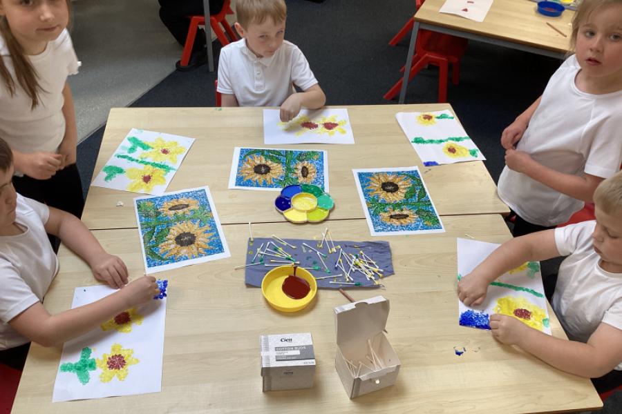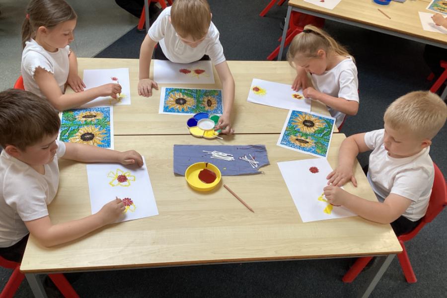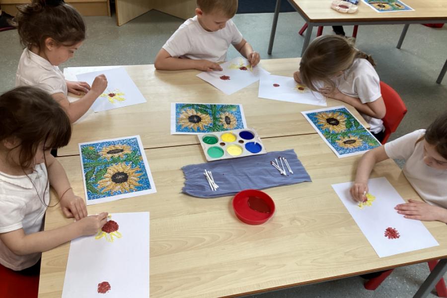 Year 1 have been creating sunflower art inspired by Georges Seurat’s pointillism technique. The children found this fun and relaxing. Instead of using a brush, the children dipped ear buds into paint and gently dab small dots onto their paper to build up their image. The children started with a simple outline of a sunflower, then layered different shades of yellow, brown, and green using tiny dots to create depth and texture. This method mimics Seurat’s style, where individual dots of colour blend together