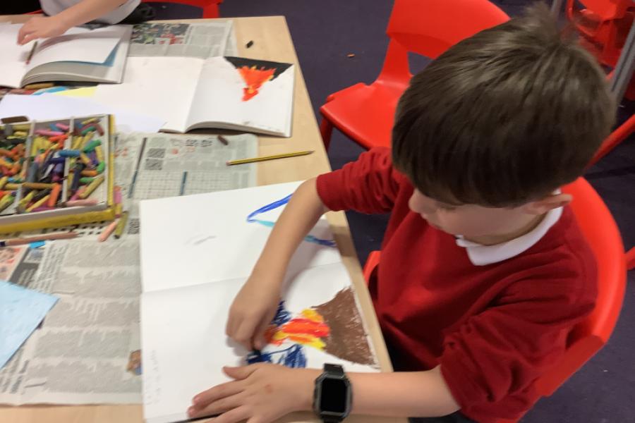 Year 3 looked at the art work by the Japanese artist Hokusai. They used watercolours to create background washes and used oil pastels to create pictures of disasters.