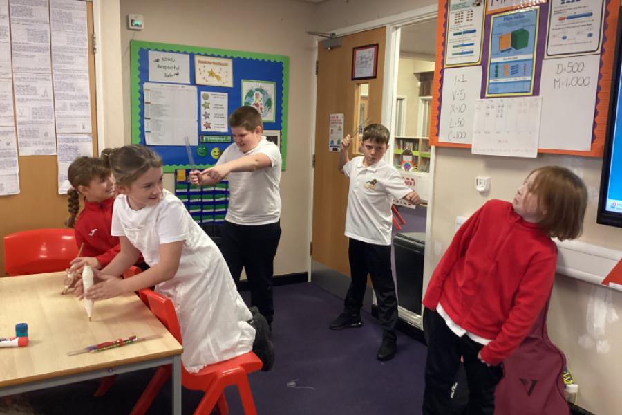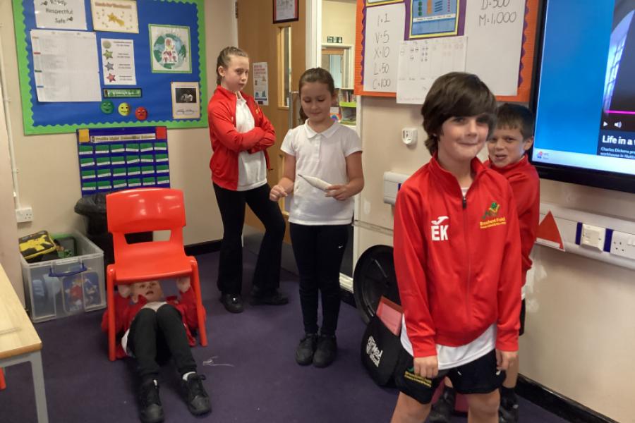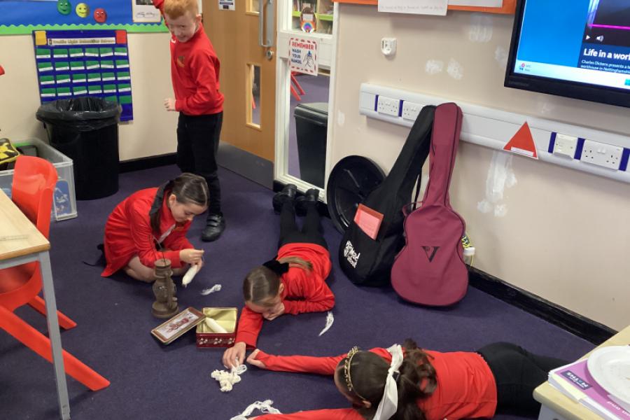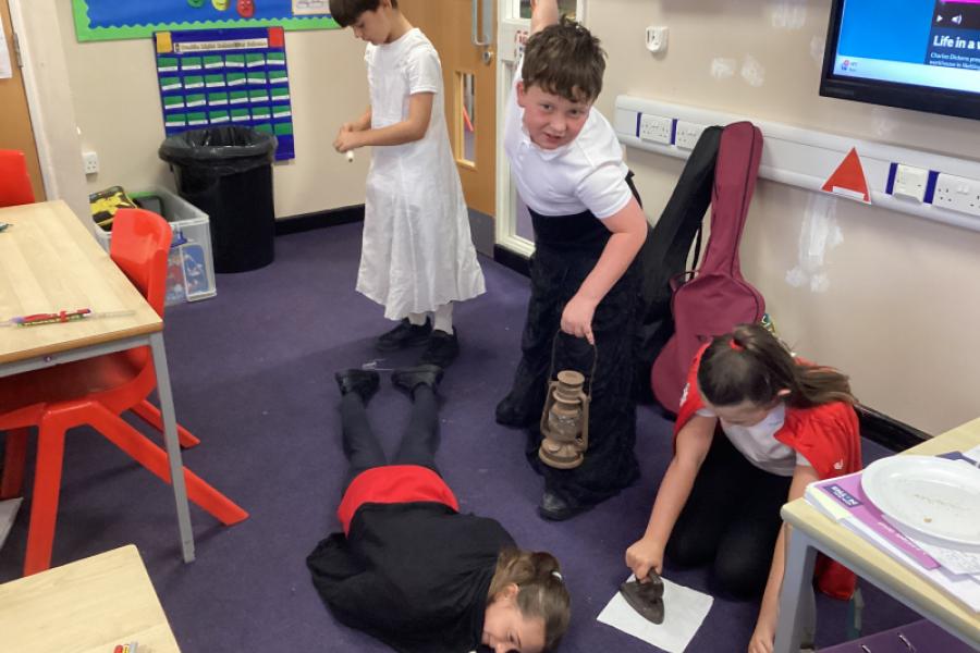 Year 5 created freeze frames of Victorian working children and shared what they were thinking at the time. The pictures show children working in cotton mills and coal mines, and some were being punished with the cane.