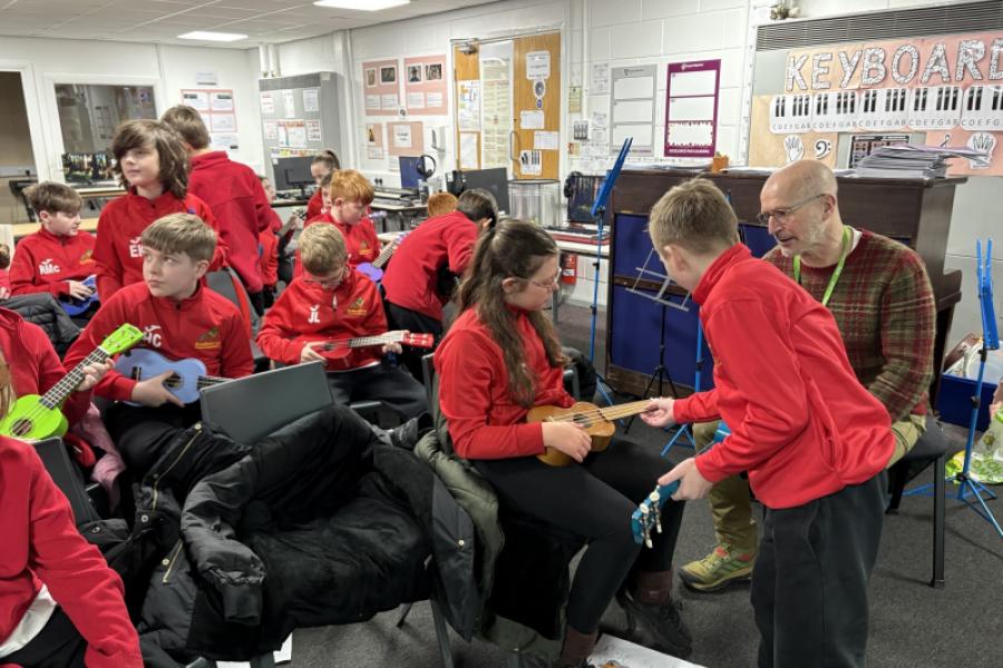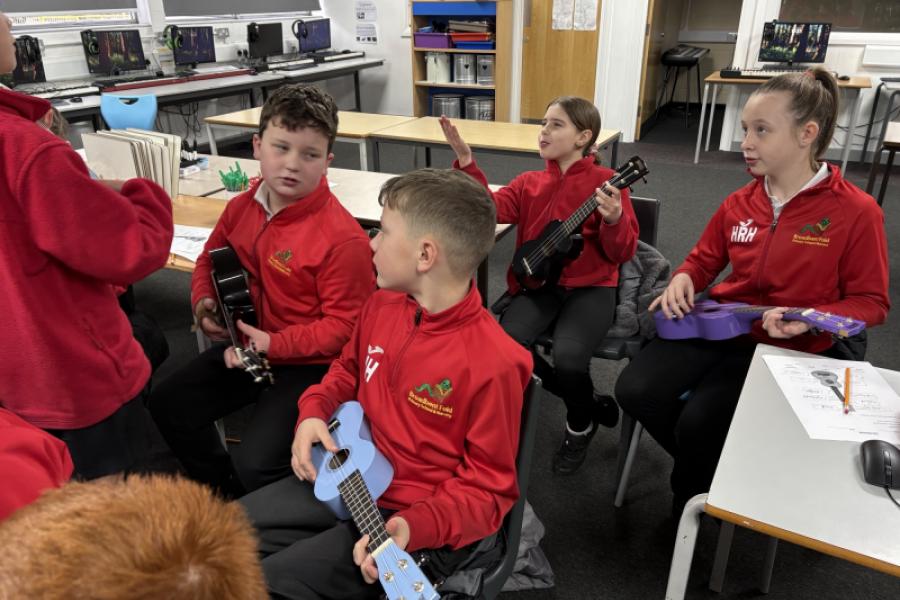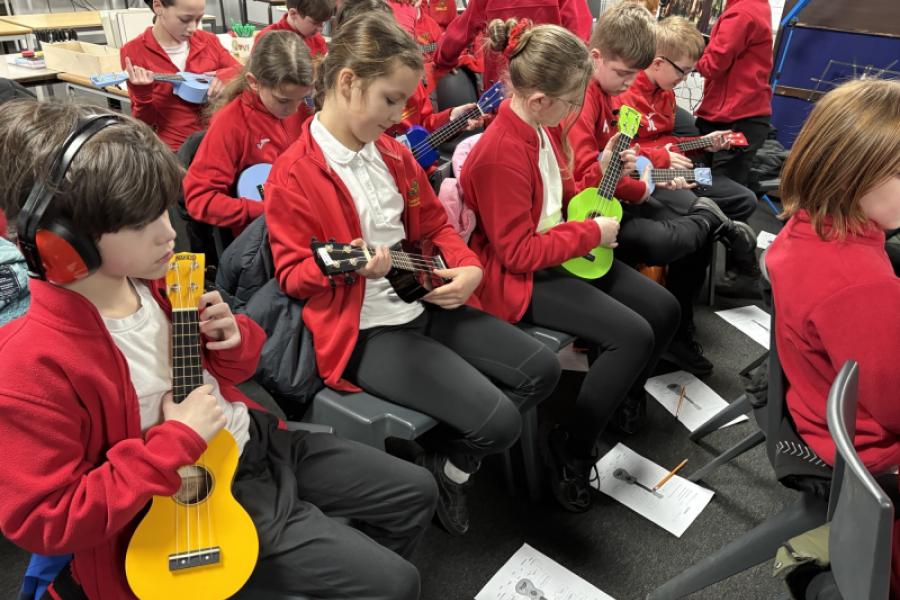 Year 5 visited Rayner today for a wonderful music taster session with ukeleles. They learnt how to play 4 chords: C, A minor, F and G. After some practise with playing the chords, the class played and sang to the song Shotgun. They were absolutely brilliant!