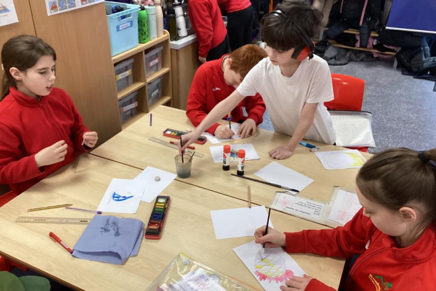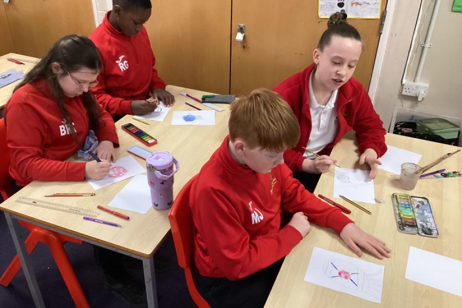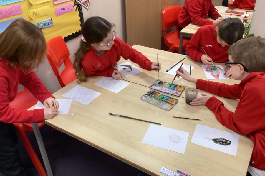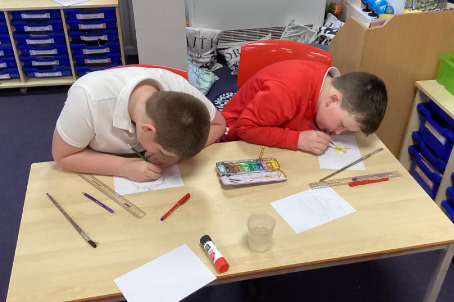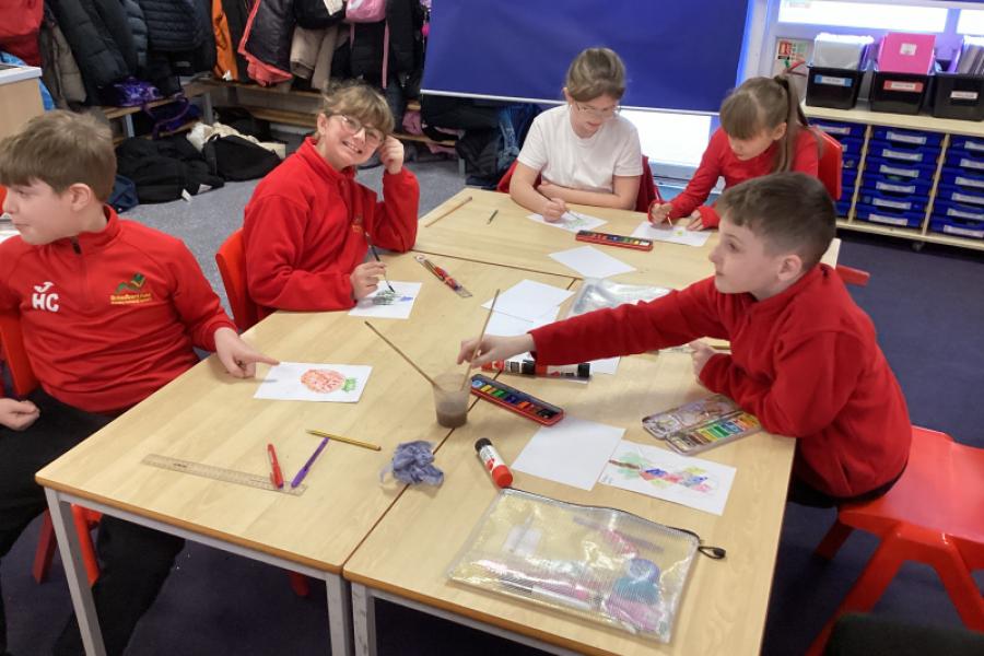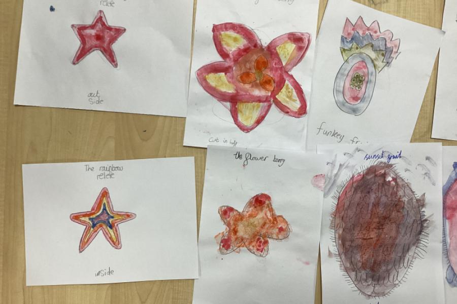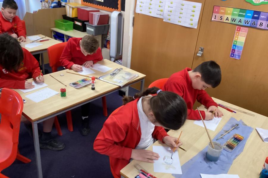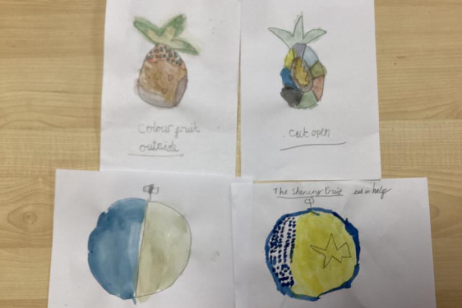 Year 5 are using water colours to create a mysterious fruit.They will be writing about their fruit in their English write-up.