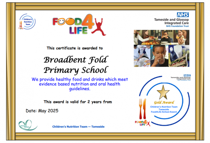 We want to provide children with rich experiences in their learning and their dining. We achieved our Gold Award with Healthy Food and Food4life. This level shows that Broadbent Fold is recognised for good practice around healthy eating and healthy lifestyles and is committed to providing a whole school approach to the provision and promotion of healthy food.